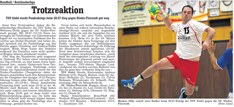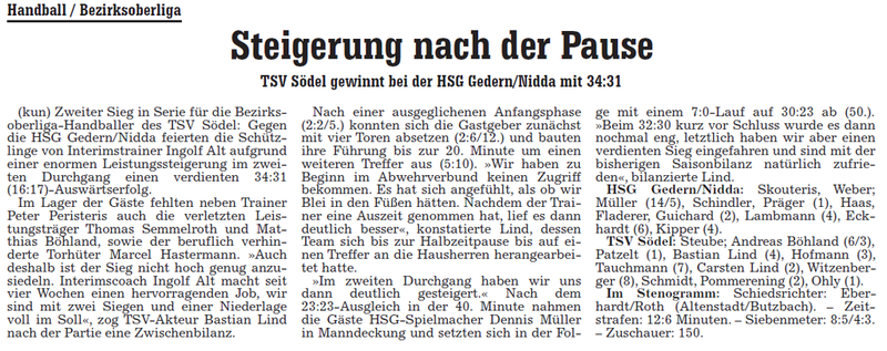 (Quelle: Wetterauer Zeitung/kun) Ein Befreiungsschlag im Abstiegskampf ist den Bezirksoberliga-Handballern des TSV Södel gelungen: Gegen die Turn- und Sportfreunde Heuchelheim feierte die Mannschaft von Trainer Ingolf Alt nach zuletzt drei Niederlagen in Serie am Samstagabend einen verdienten 36:34 (21:12)-Heimerfolg. „Die erste Halbzeit hui, die zweite Halbzeit pfui", zog TSV-Akteur Bastian Lind, mit zehn Treffern erfolgreichster Södeler Werfer der Partie, ein durchwachsenes Fazit. Die Gastgeber begannen stark, lagen vor 150 Zuschauern früh mit fünf Toren in Front (7:2/10.) und bauten diesen Vorsprung bis zur 15. Minute auf sieben Tore aus (10:3). Schnell und konsequent setzten die Gastgeber zu gefährlichen Kontern an, während die TSF im Angriff zu viele freie Chancen ungenutzt ließ. Beim 18:8 in der 24. Minute konnte man gegen das Gästeteam von Trainer Wilfried Weber erstmals eine Zehn-Tore-Führung bejubeln. Nach dem Seitenwechsel knüpften die Hausherren an ihre herausragende Leistung aus dem ersten Durchgang an und gaben gegen den Tabellensechsten zunächst weiter den Ton an (24:14/36.), ehe die Gäste aus Heuchelheim in der Folge besser in die Partie fanden und den Södeler Vorsprung auf drei Tore verkürzten (27:24/48.). „In dieser Phase hat mein Team eine sehr gute Moral bewiesen", zeigte sich Gästecoach Weber angetan von der Leistung seiner Schützlinge. Die Folge: Beim 31:29 musste der gastgebende Tabellenzehnte noch einmal zittern, ehe man beim 34:29 für eine Vorentscheidung gesorgt hatte. „Die desolate erste Halbzeit hat uns die Punkte gekostet", wusste Weber, während auf Södeler Seite nach dem wichtigen Befreiungsschlag im Abstiegskampf große Erleichterung zu spüren war. „Ein verdienter Sieg, auch wenn es zum Ende hin noch einmal eng wurde. Der zur Halbzeit herausgespielte Vorsprung hat uns glücklicherweise ausgereicht", konstatierte Lind.